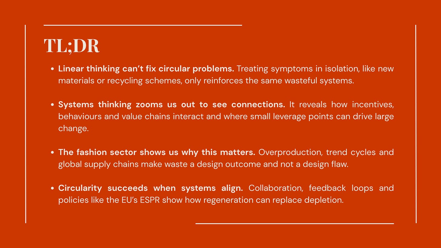 Linear thinking tells us that problems can be fixed one part at a time. In fashion, that looks like swapping one material for another or launching a recycling take-back program while the rest of the system keeps churning out cheap clothes at record speed. Each fix treats the symptom and not the structure. This results in waste piling up faster than any recycling scheme can handle, while overproduction keeps climbing because the system is rewarded for selling more, not better.